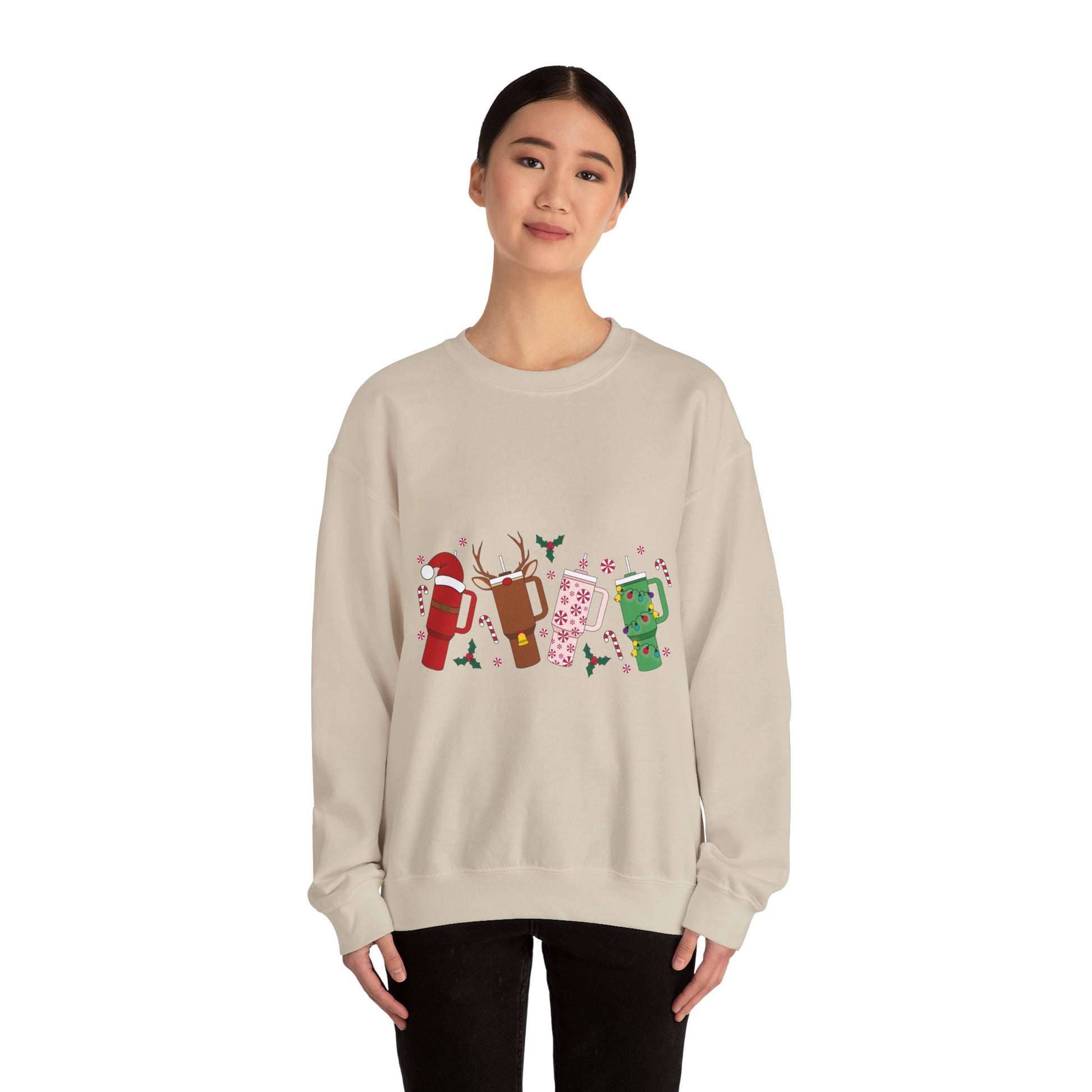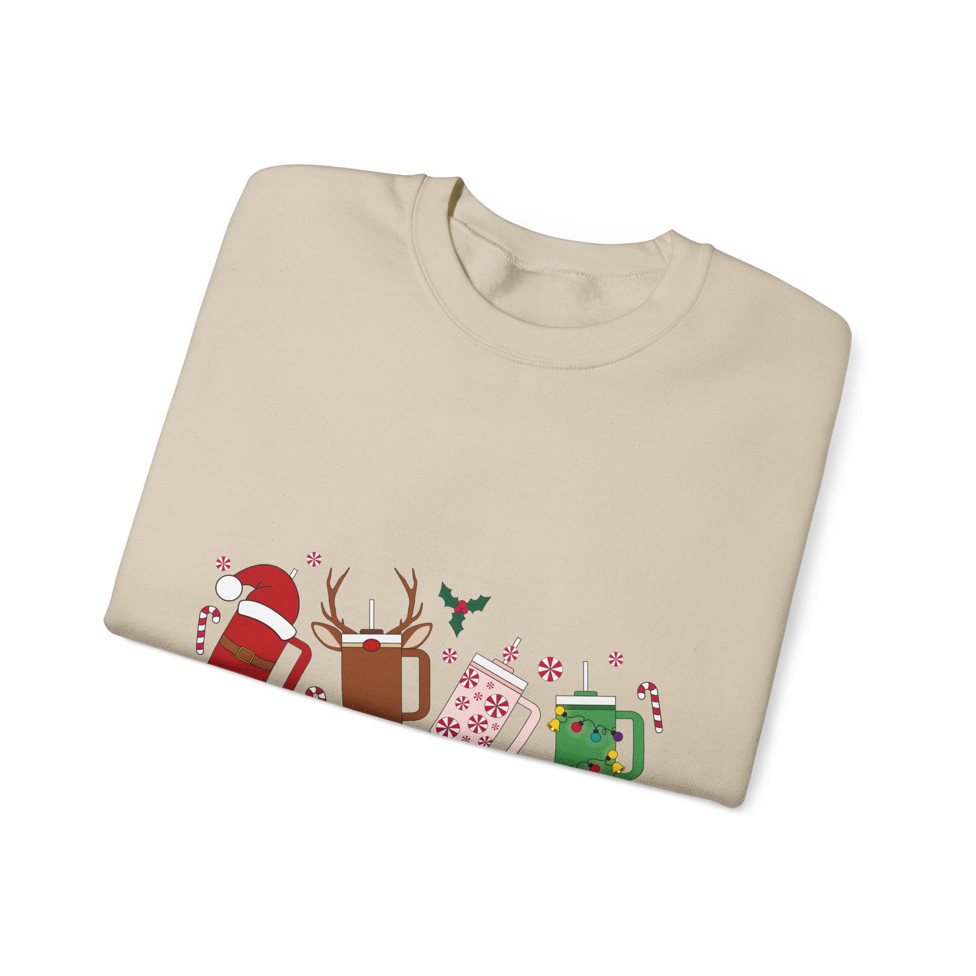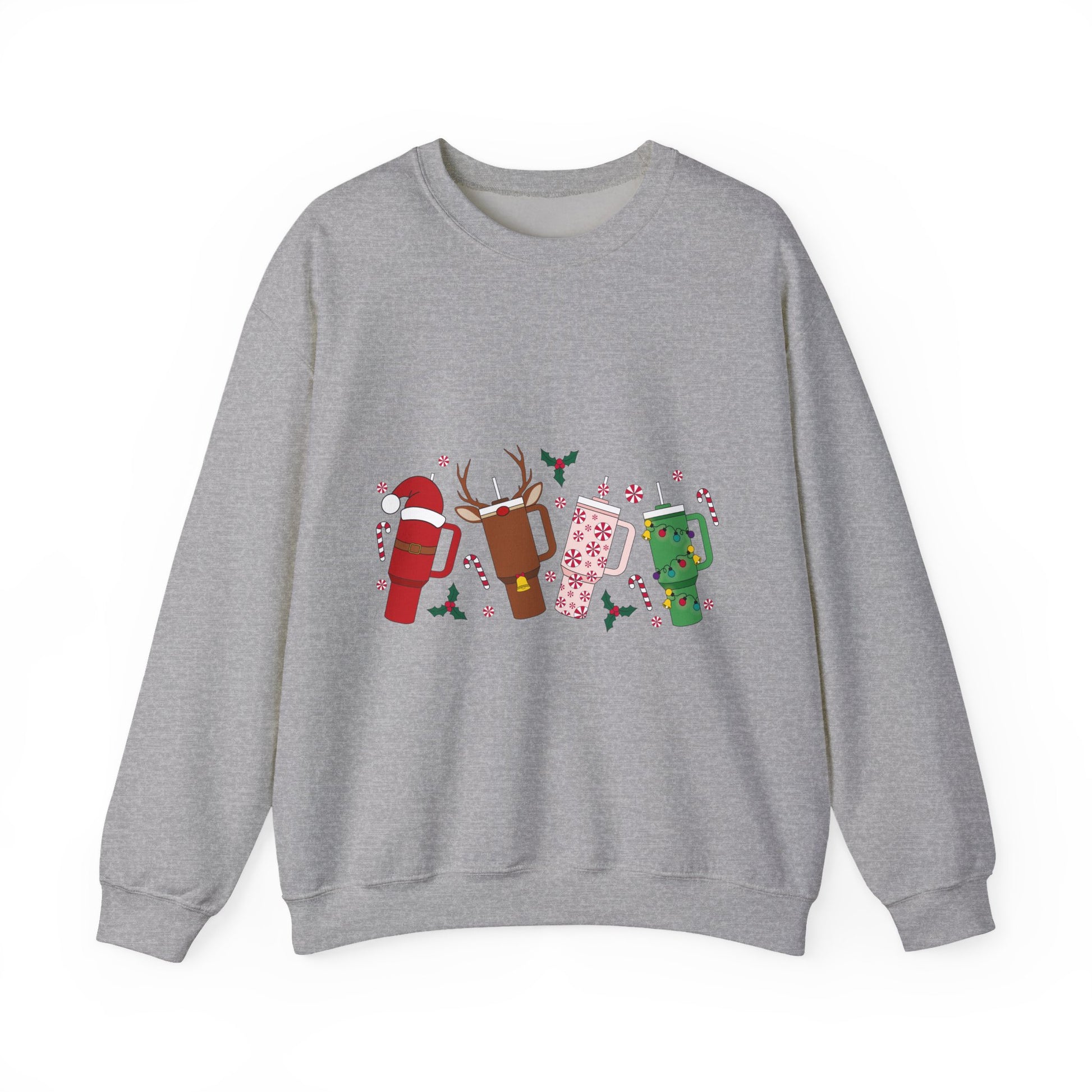 Soft, cozy, and quietly festive — this crewneck sweatshirt carries a playful holiday scene across the chest: three merry thermoses in red, brown, and green, decked with reindeer antlers, scarves, and tiny seasonal motifs. The mid-weight cotton-poly blend feels warm without bulk, and the classic crew neckline and clean-cut fit make it easy to layer over a tee or under a coat during chilly outings. Embroidered-print options and durable double-needle stitching mean the design and construction hold up wash after wash. Wear it while sipping spiced drinks at a winter market, wrapping gifts by lamplight, or lounging by the tree with friends; the design brings a lighthearted, handcrafted vibe to low-key holiday moments.