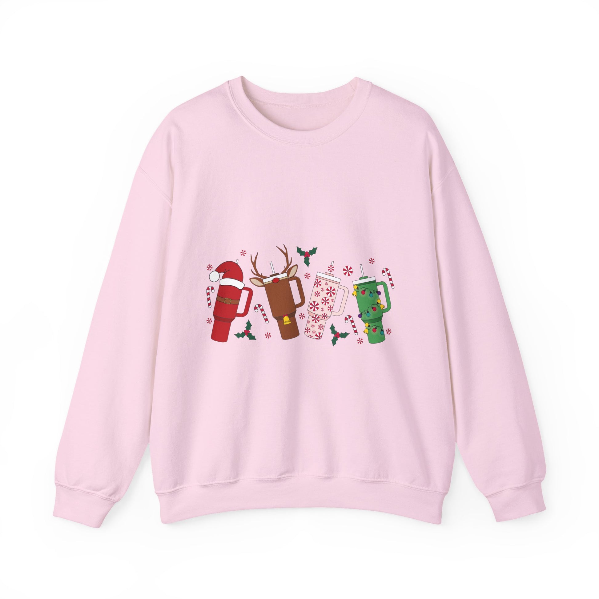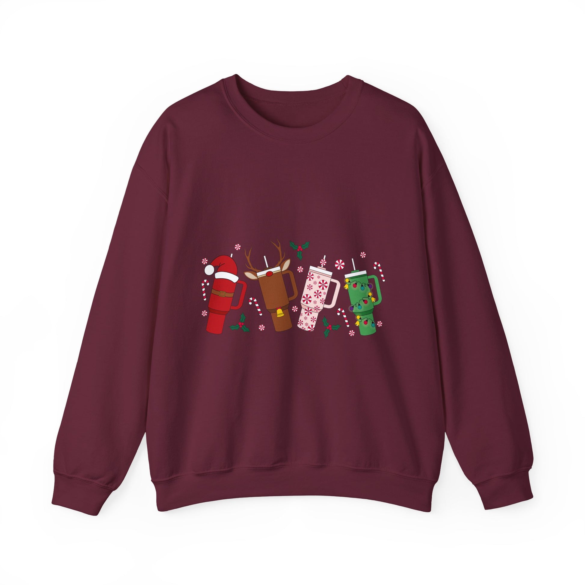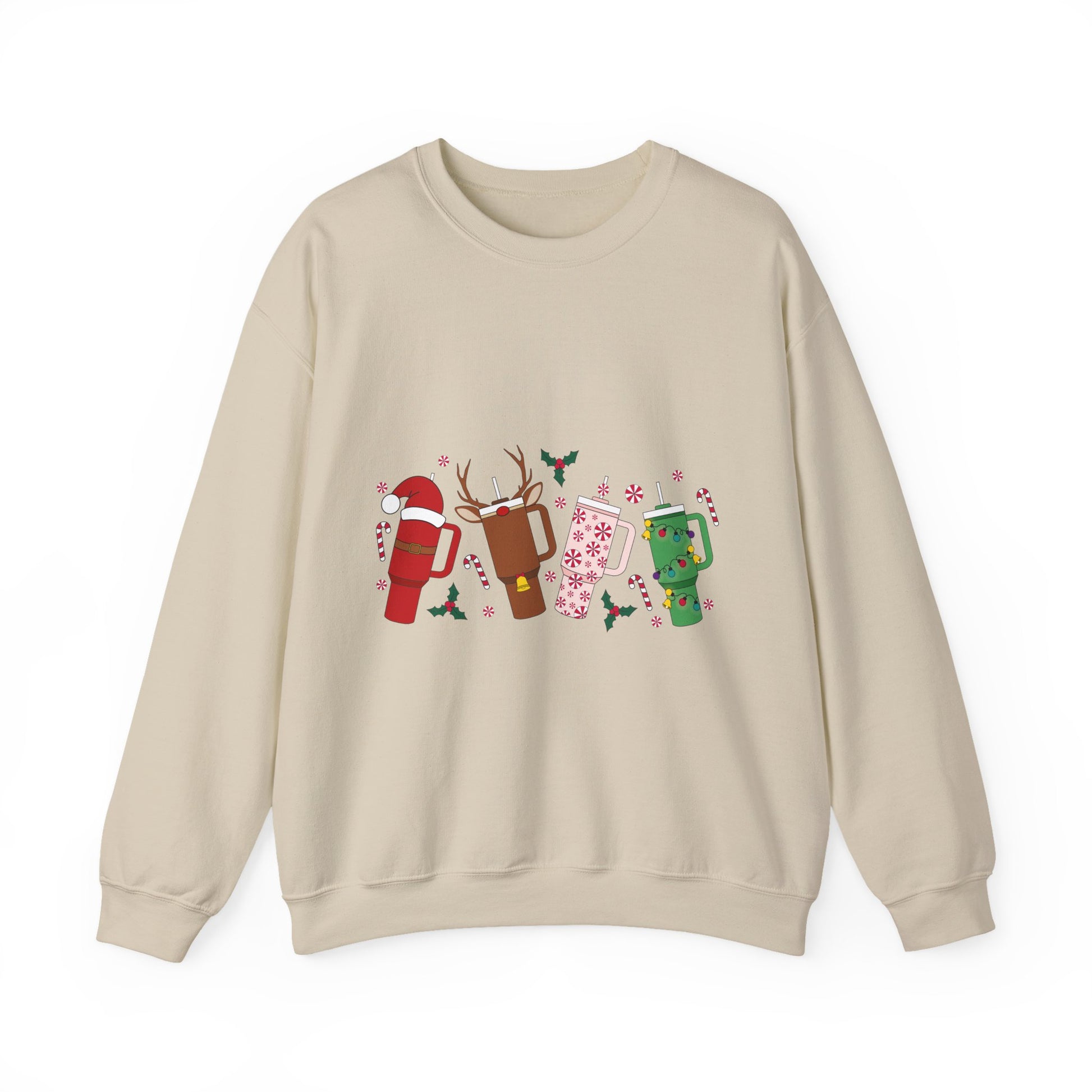 Soft, cozy, and quietly festive — this crewneck sweatshirt carries a playful holiday scene across the chest: three merry thermoses in red, brown, and green, decked with reindeer antlers, scarves, and tiny seasonal motifs. The mid-weight cotton-poly blend feels warm without bulk, and the classic crew neckline and clean-cut fit make it easy to layer over a tee or under a coat during chilly outings. Embroidered-print options and durable double-needle stitching mean the design and construction hold up wash after wash. Wear it while sipping spiced drinks at a winter market, wrapping gifts by lamplight, or lounging by the tree with friends; the design brings a lighthearted, handcrafted vibe to low-key holiday moments.