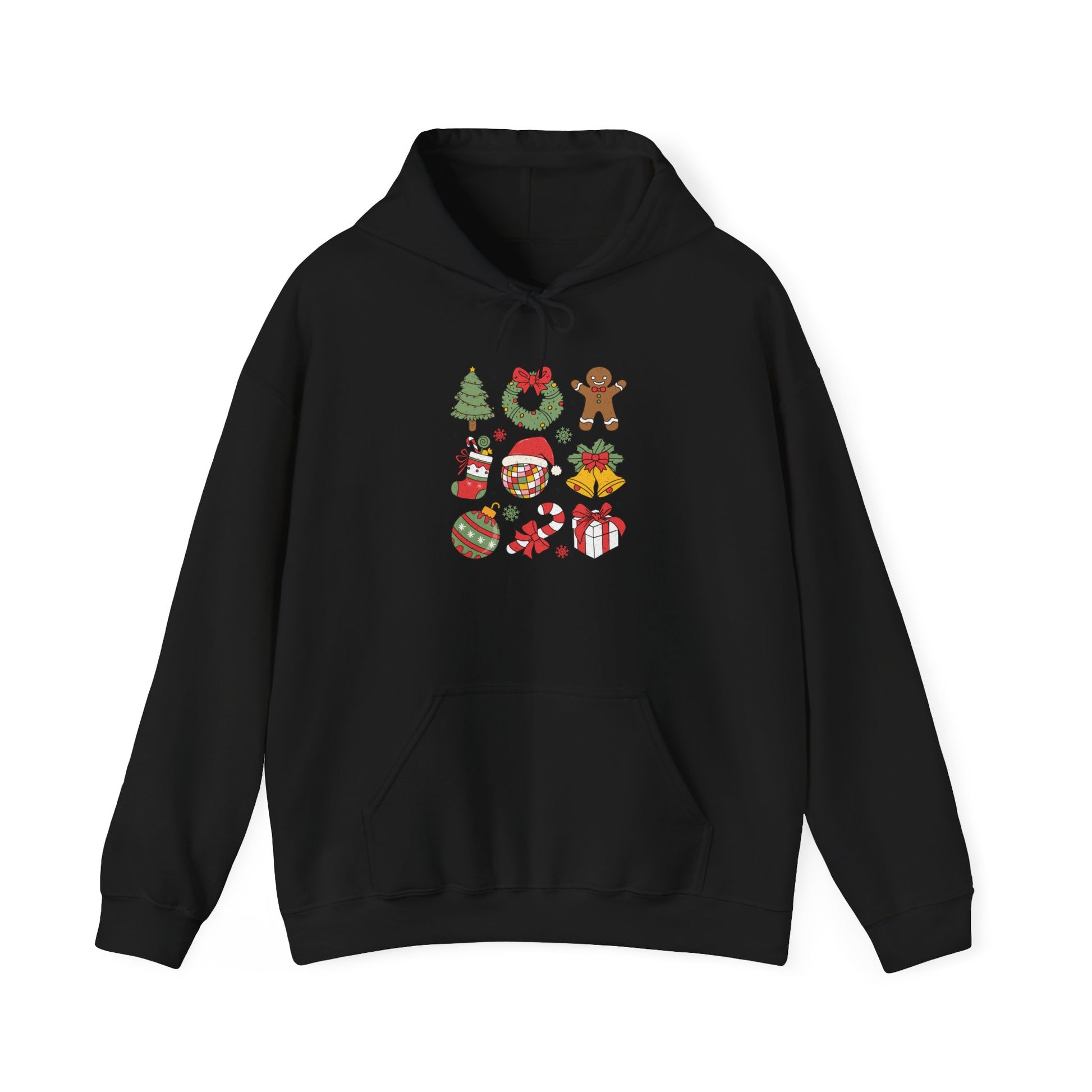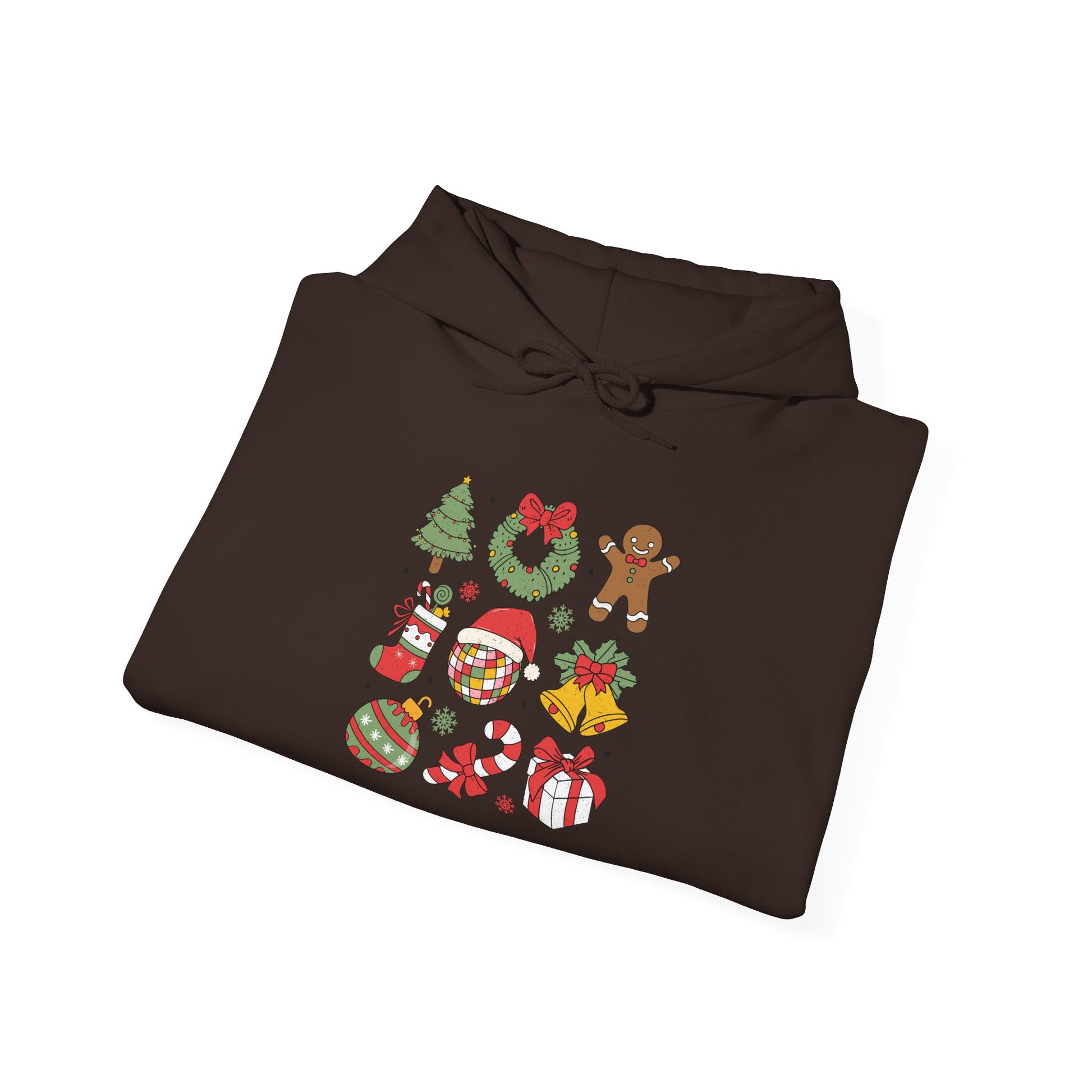 Introducing the ultimate cozy companion for the holiday season: a unisex heavy blend hooded sweatshirt. Perfect for frosty days, this sweatshirt envelops you in warmth, making it a fantastic choice for festive gatherings or relaxing at home with loved ones. With its cheerful holiday-themed design featuring festive icons like ornaments, trees, and gingerbread, it instantly elevates your mood and spreads joy. Ideal for both casual days and special occasions, this sweatshirt is a delightful gift for family and friends alike. Whether you're celebrating Christmas, a winter birthday, or cozying up on Christmas Eve, this sweatshirt adds a spirited touch to your wardrobe.