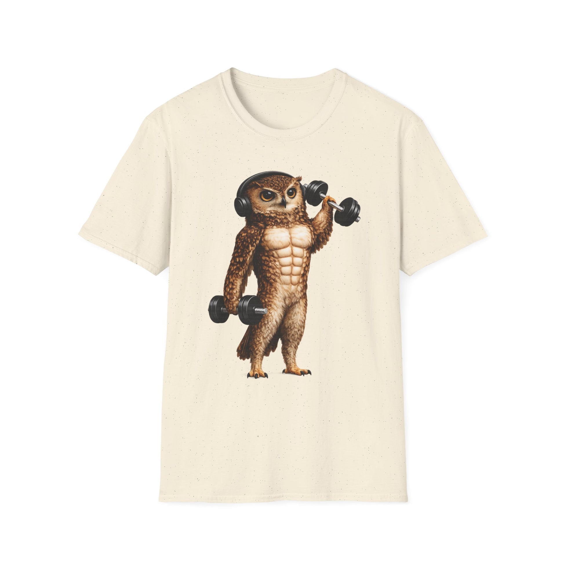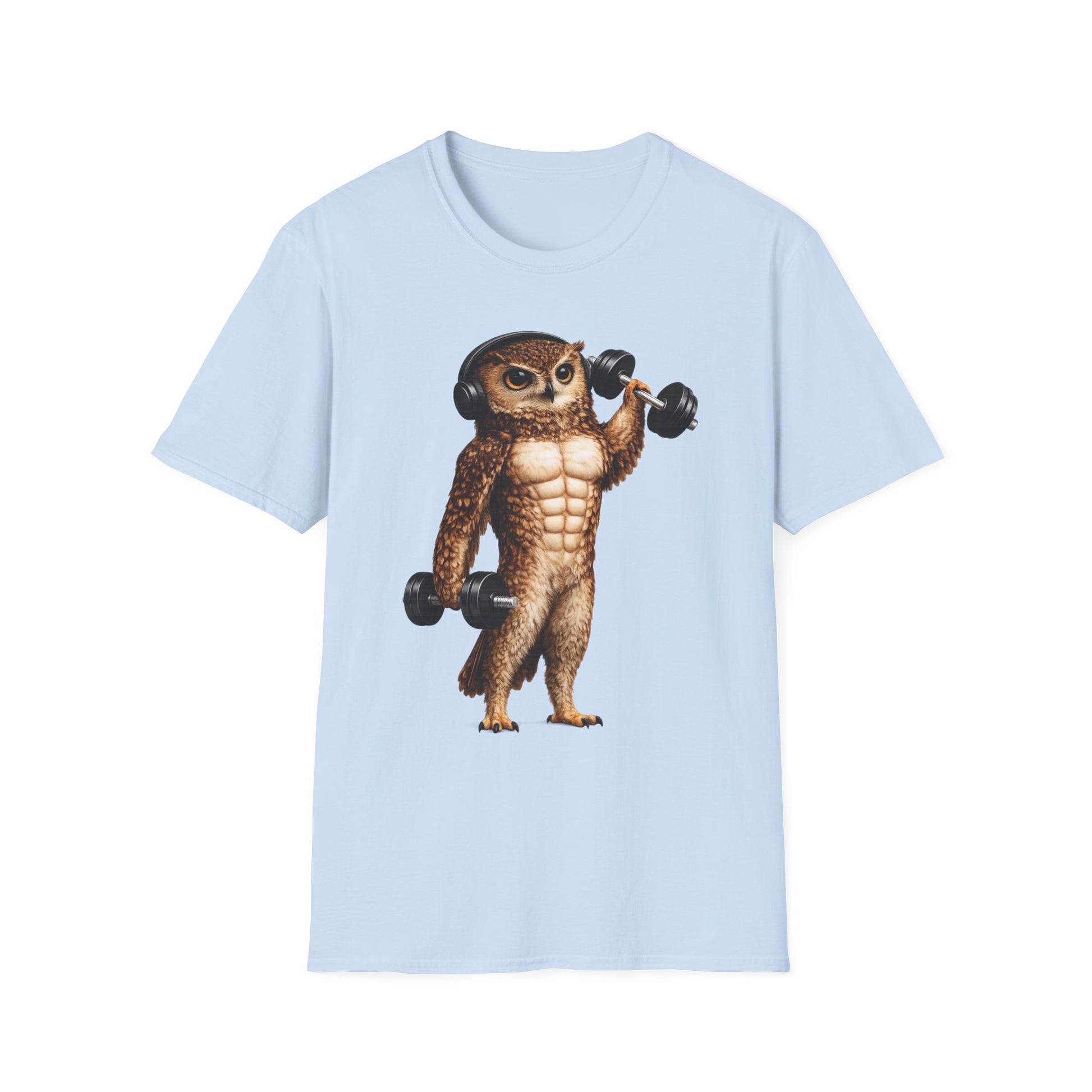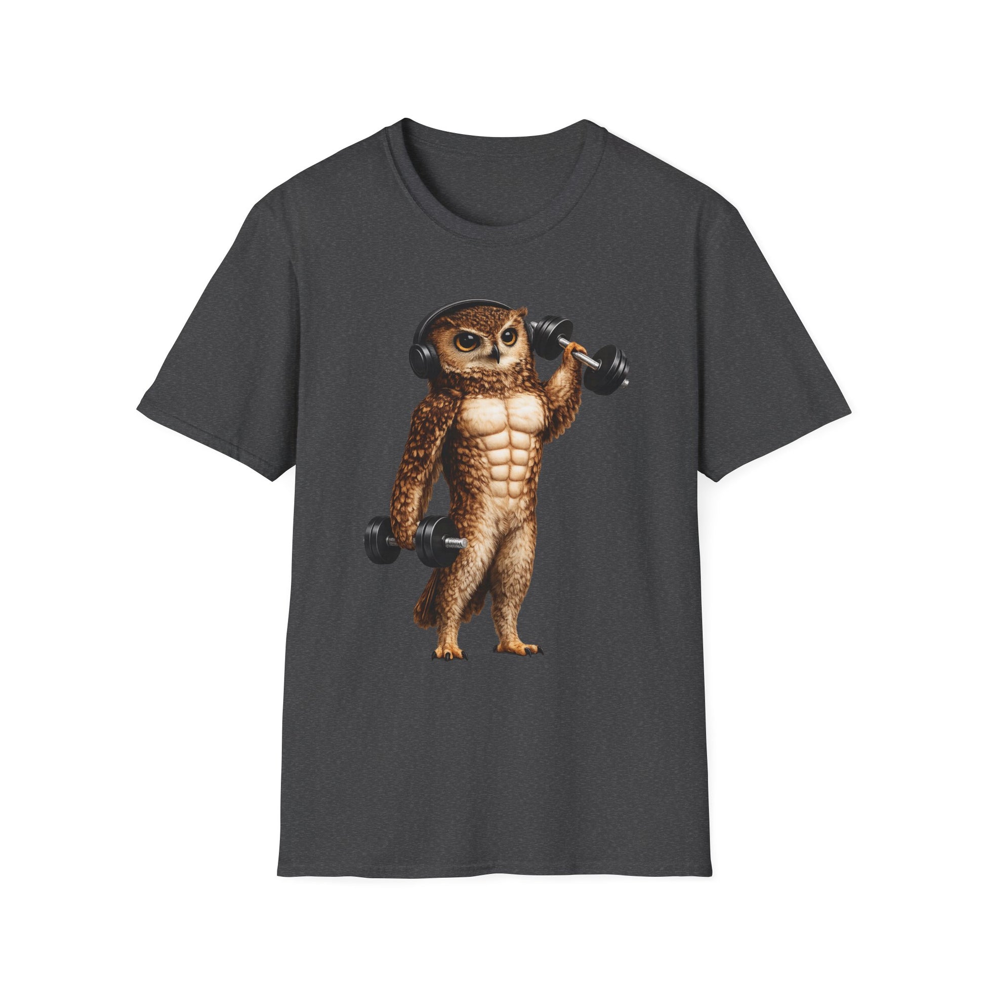 Light, soft, and playful — this classic crew tee carries a whimsical illustration of a buff owl lifting dumbbells, headphones perched over its round head. The Gildan softstyle fabric drapes cleanly and feels gentle against skin, so the design reads bright and crisp while you move. Wear it to the gym, on morning runs, or while lounging after a session; the shirt’s relaxed silhouette and tear-away label keep focus on comfort. The natural cotton options show tiny flecks that give a handcrafted look, while durable printing methods ensure the artwork stays vivid wash after wash. This shirt fits into training days, casual meetups, or slow weekend mornings when you want a bit of humor with your routine.