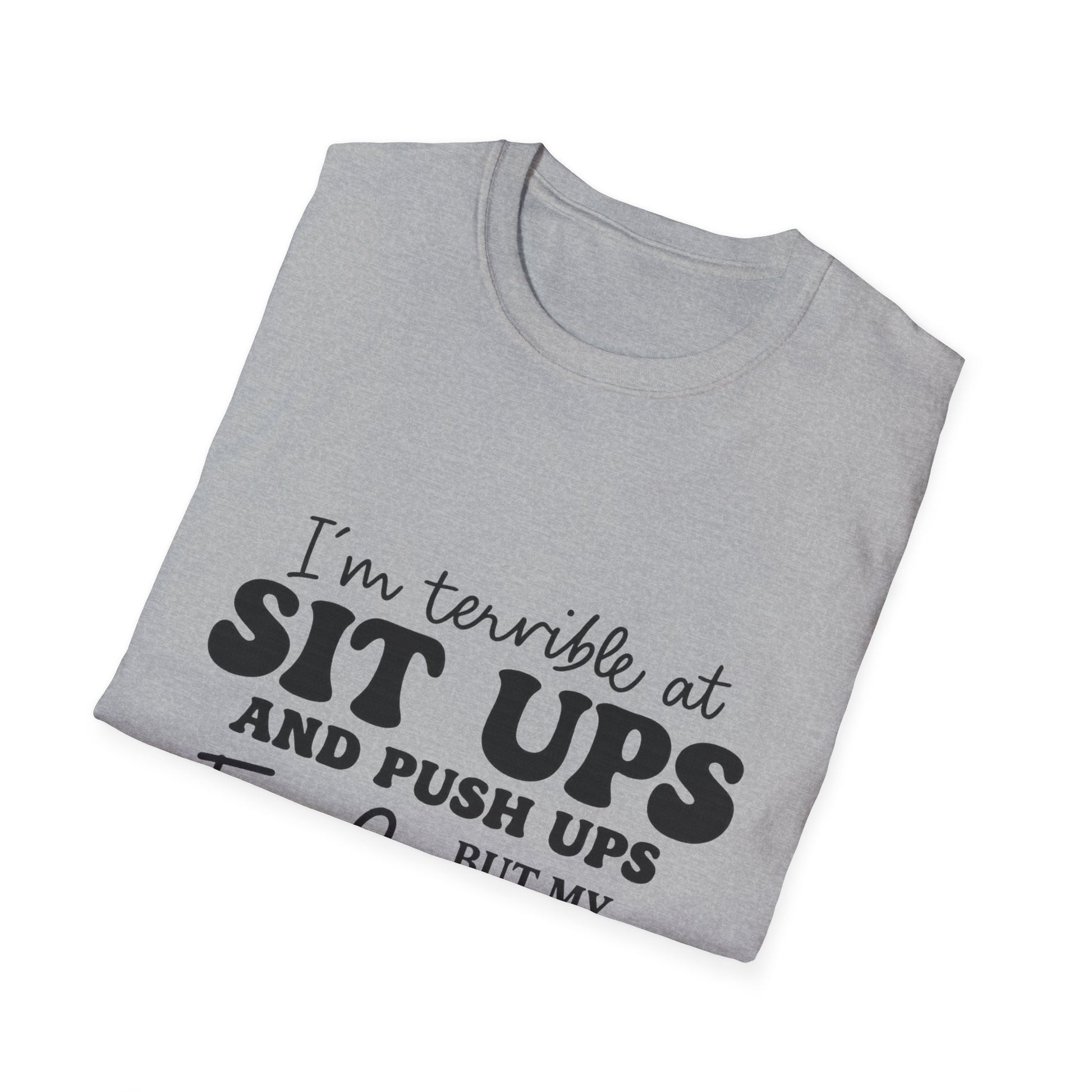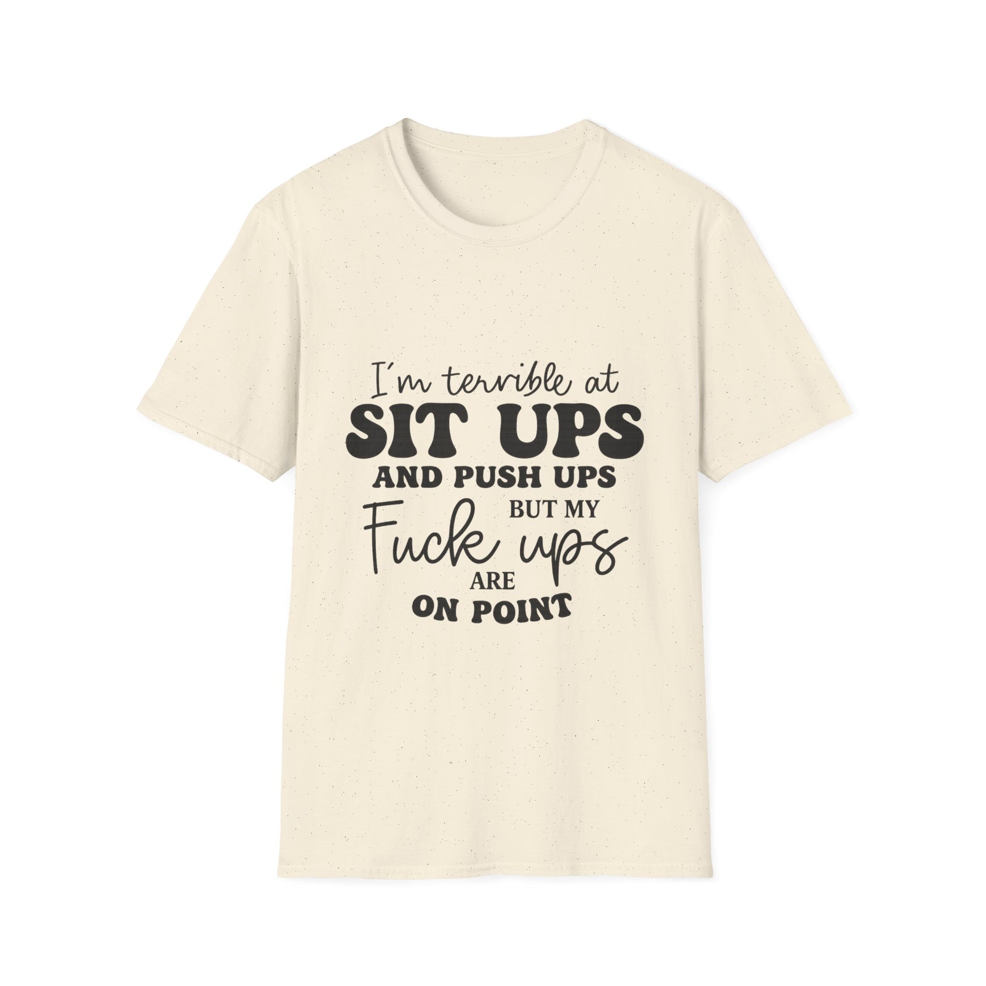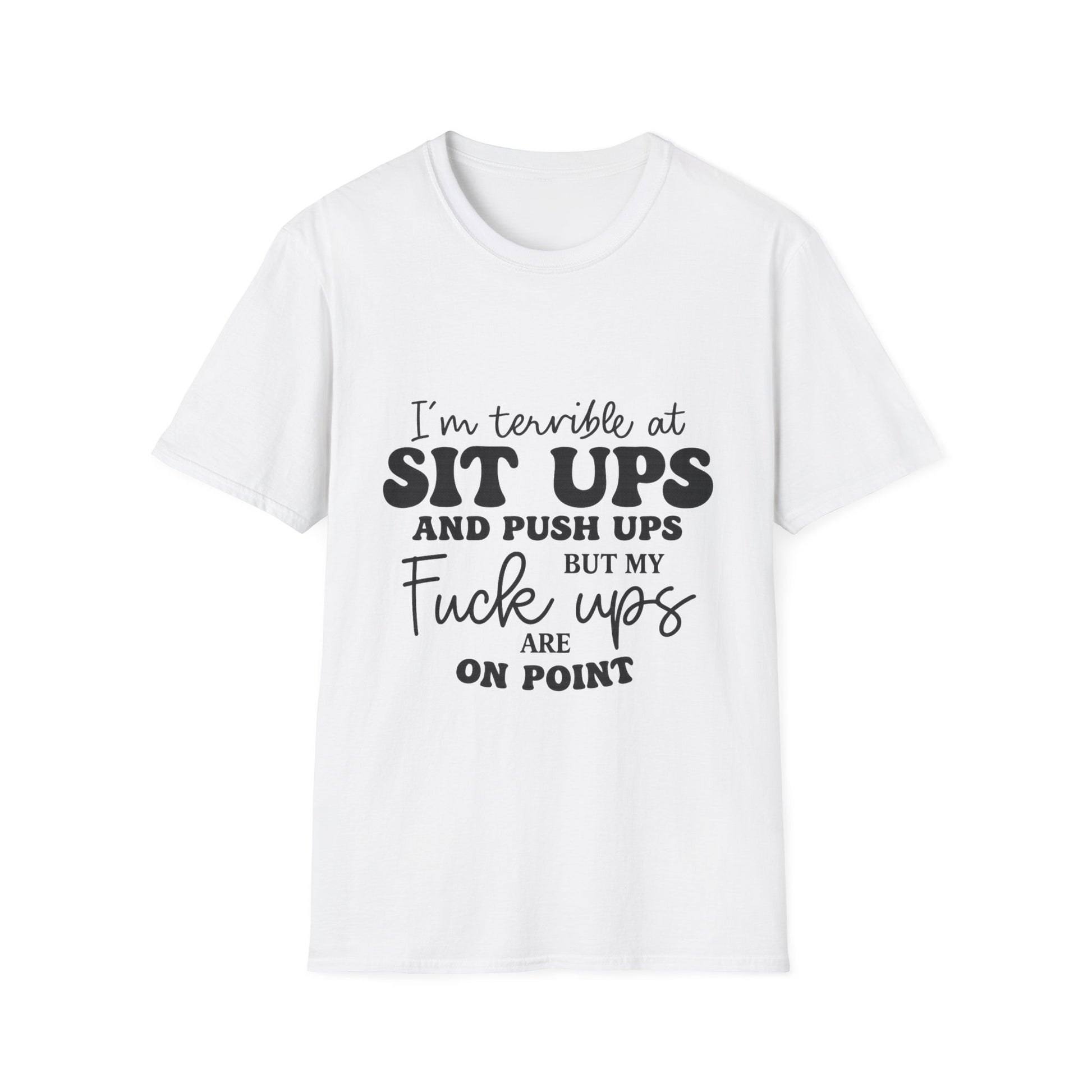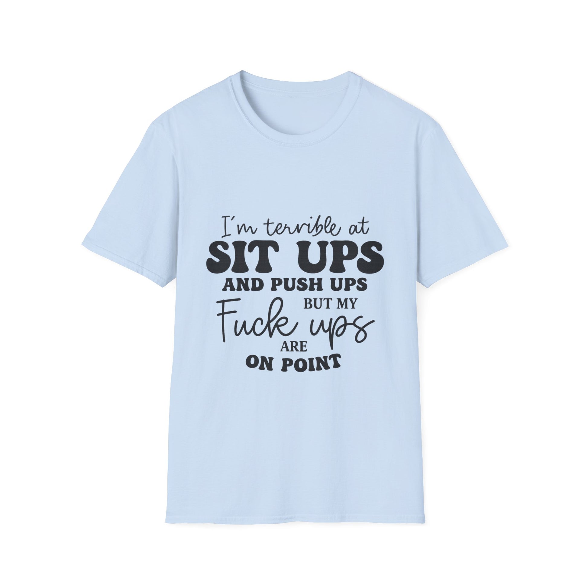 Funny Graphic T-Shirt — “I’m Terrible at Sit Ups and Push Ups But My Fuck Ups Are On Point”