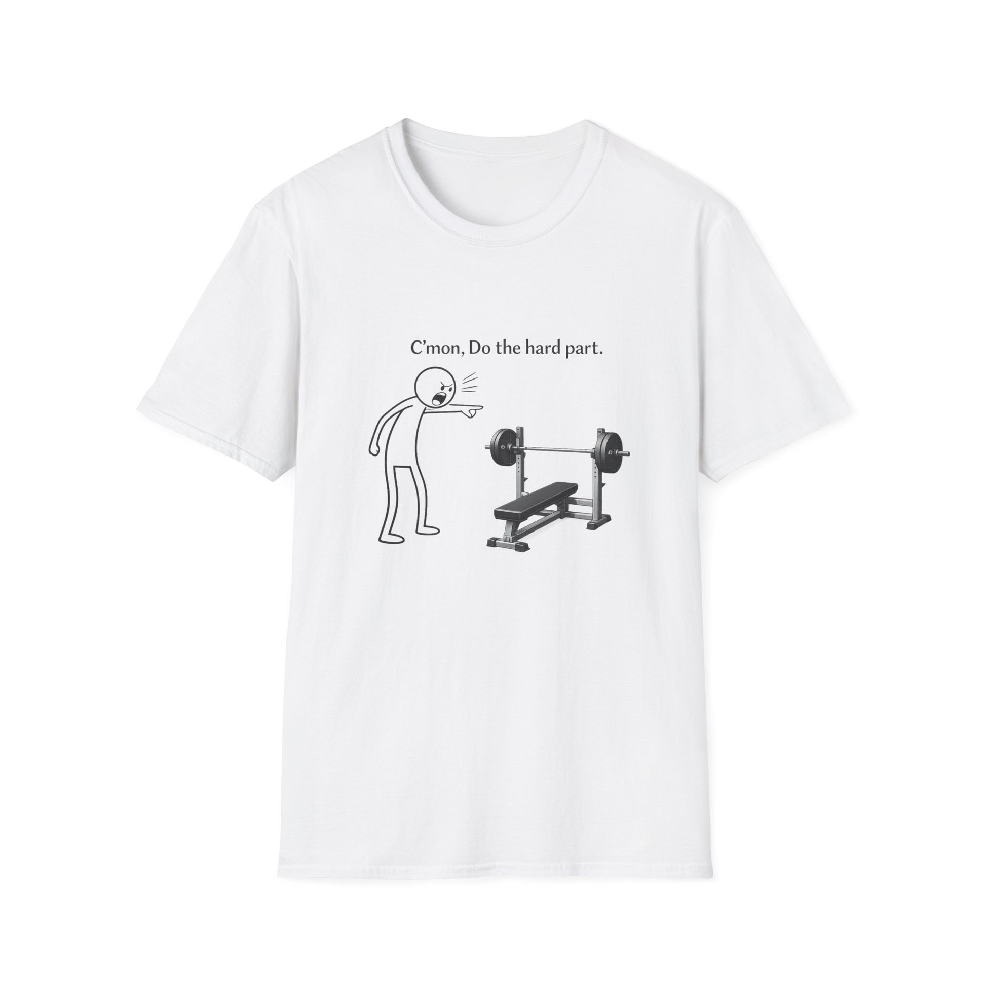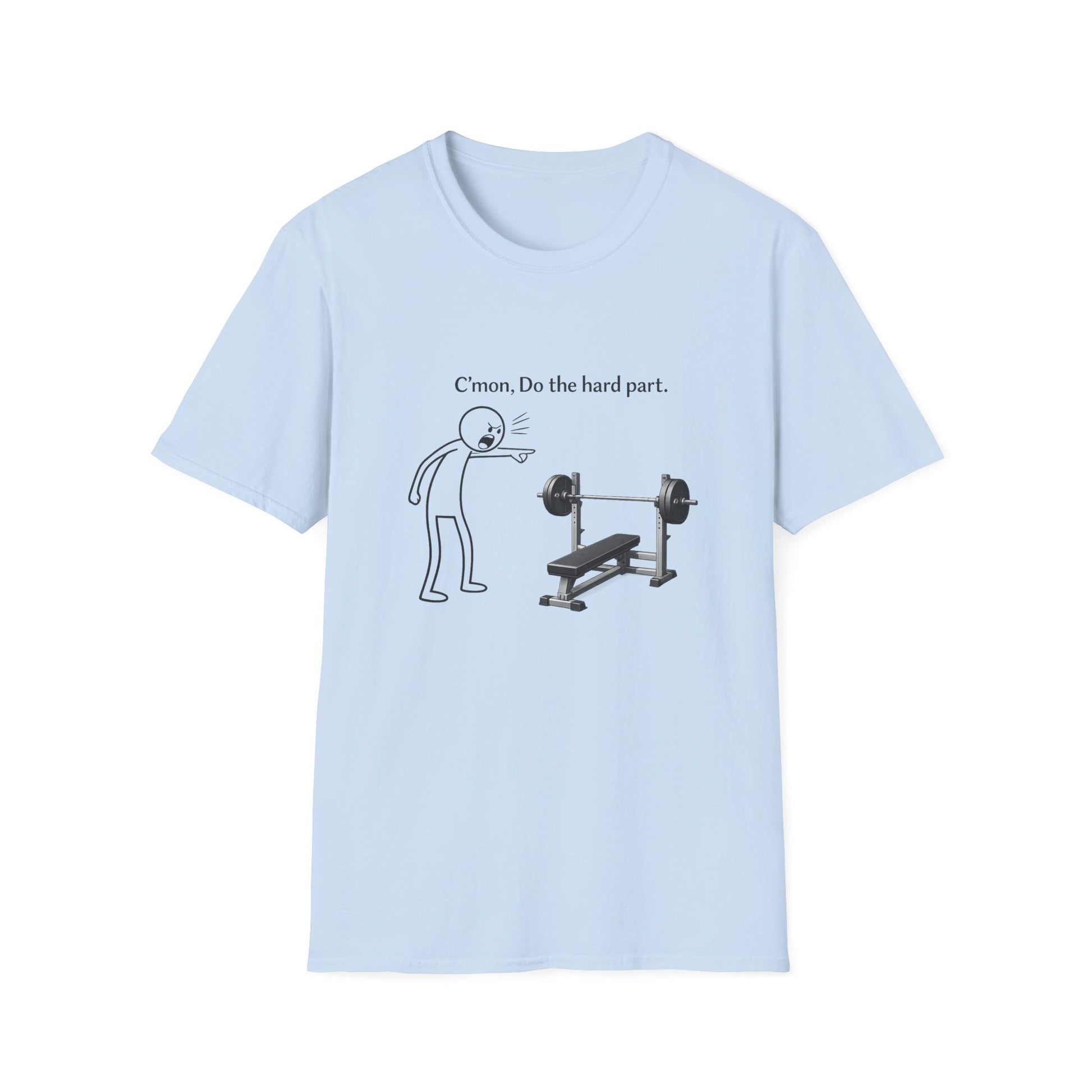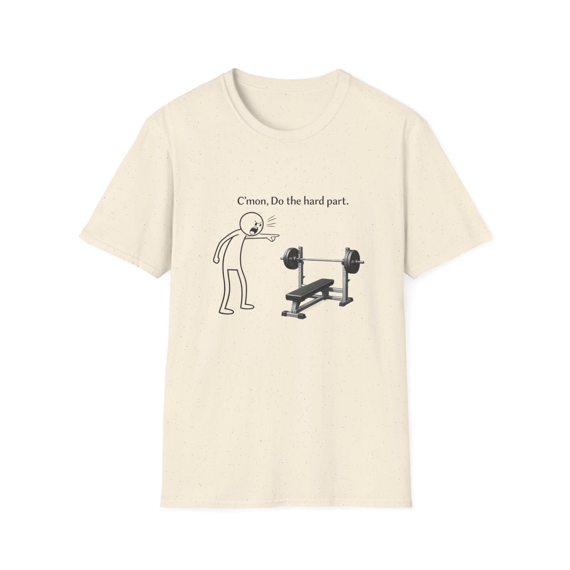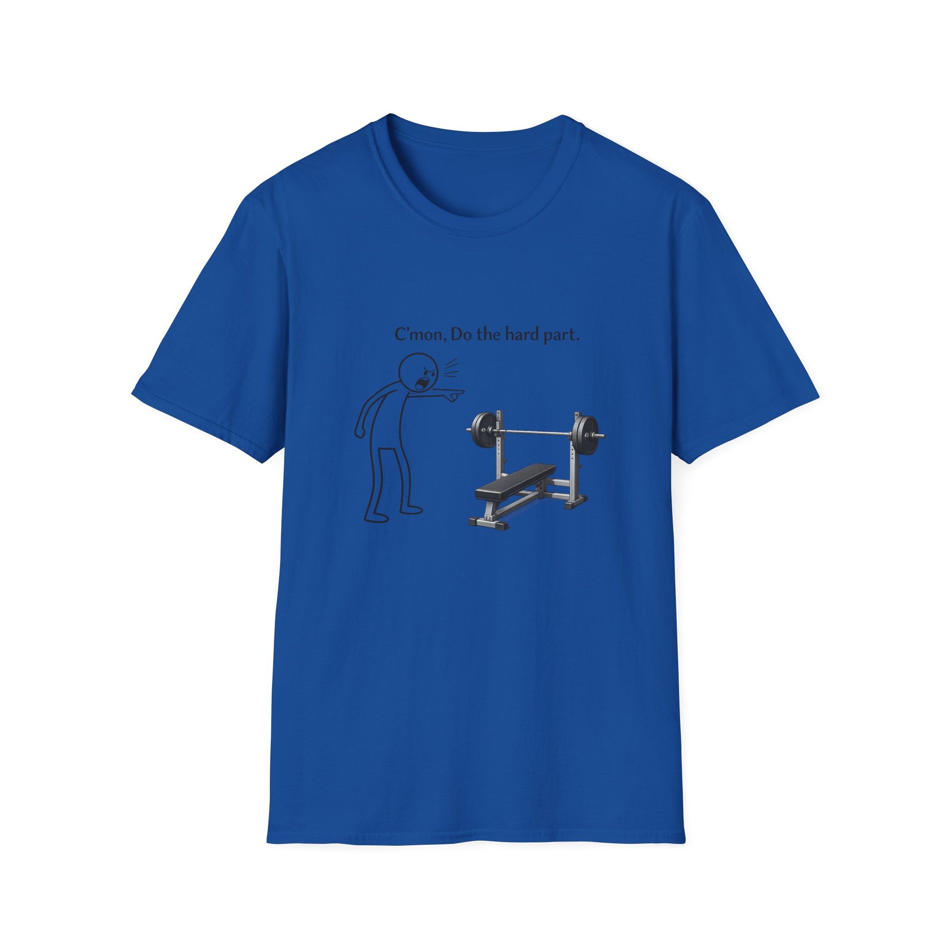 Funny Gym T-Shirt — “C’mon, Do the hard part.” Bench Press Cartoon Tee
