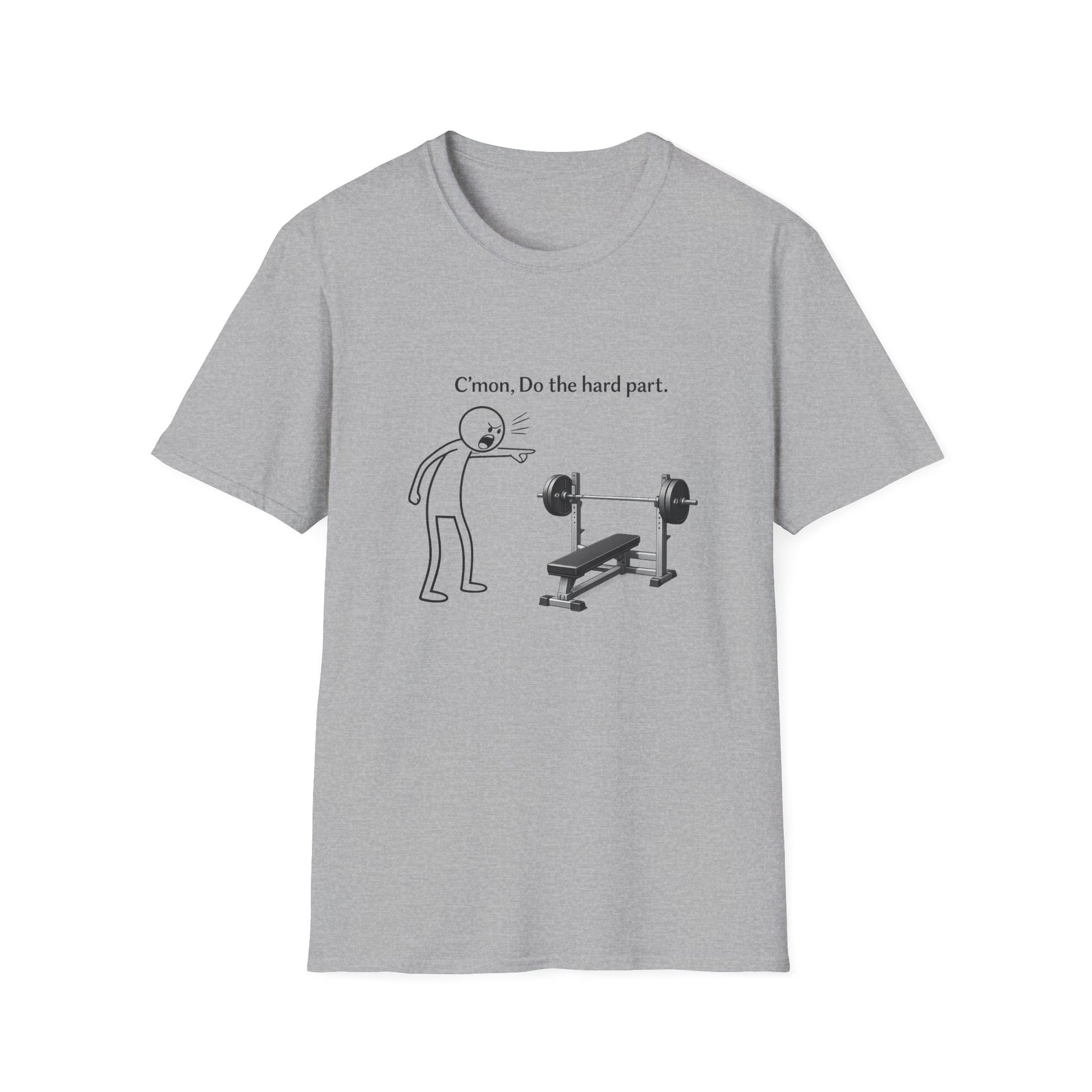 A lightweight, everyday tee that brings a wink to the weight room. The soft, ring-spun cotton feels smooth against the skin while the clean crew neckline and classic fit keep the silhouette simple and wearable. The front print shows a deadpan stick figure prodding a loaded bench with the caption “C’mon. Do the hard part.” — a quiet, clever nod to gym grinds and mental hurdles. Wear it to warm up, to rest between sets, or around town when you want to carry that same stubborn, dry-humor energy. Breathable and durable, it holds up to repeats in the laundry and the gym bag.