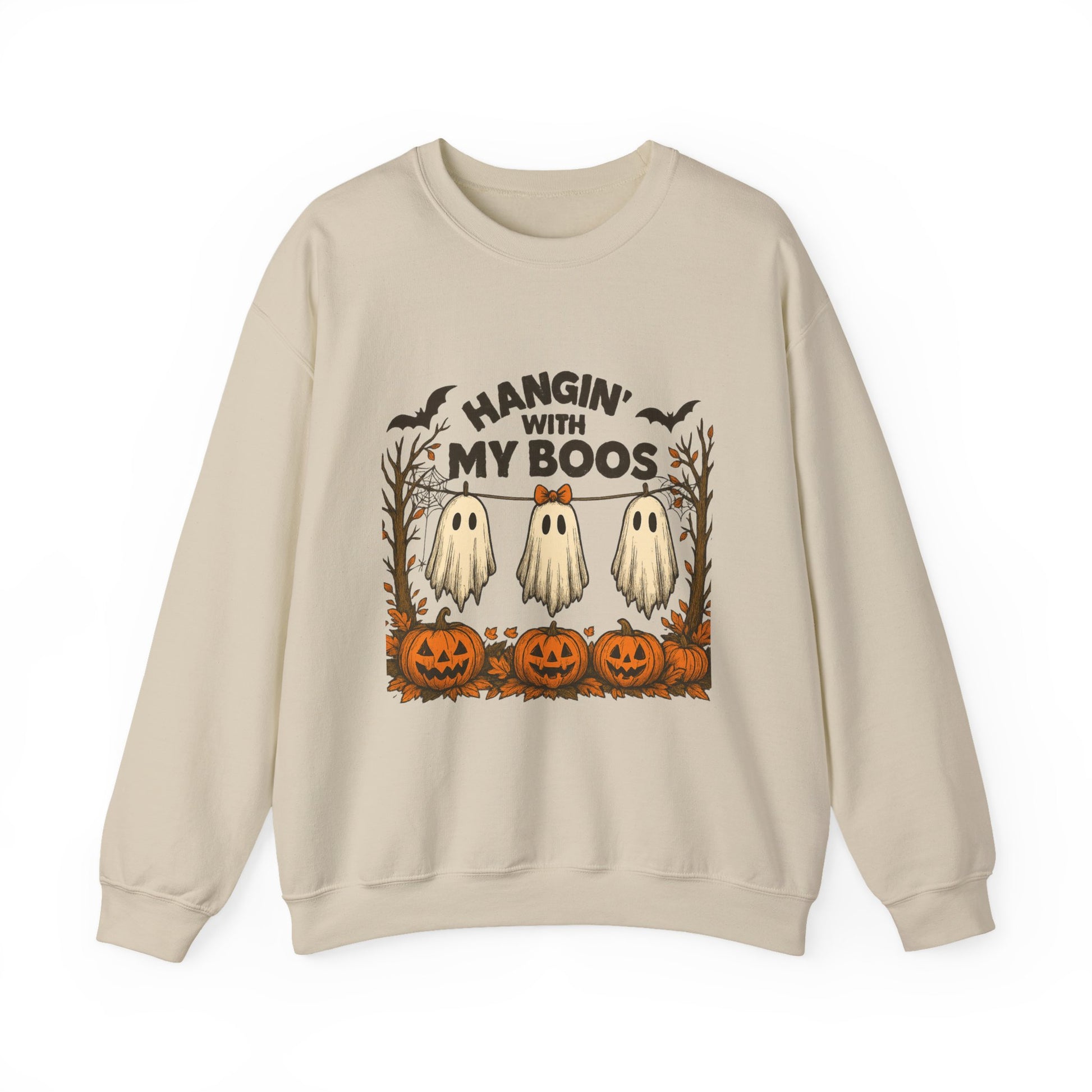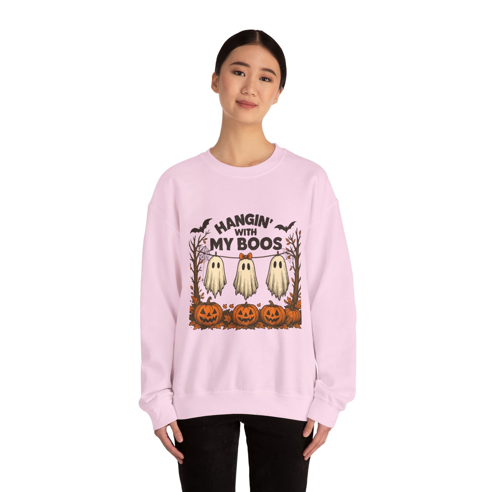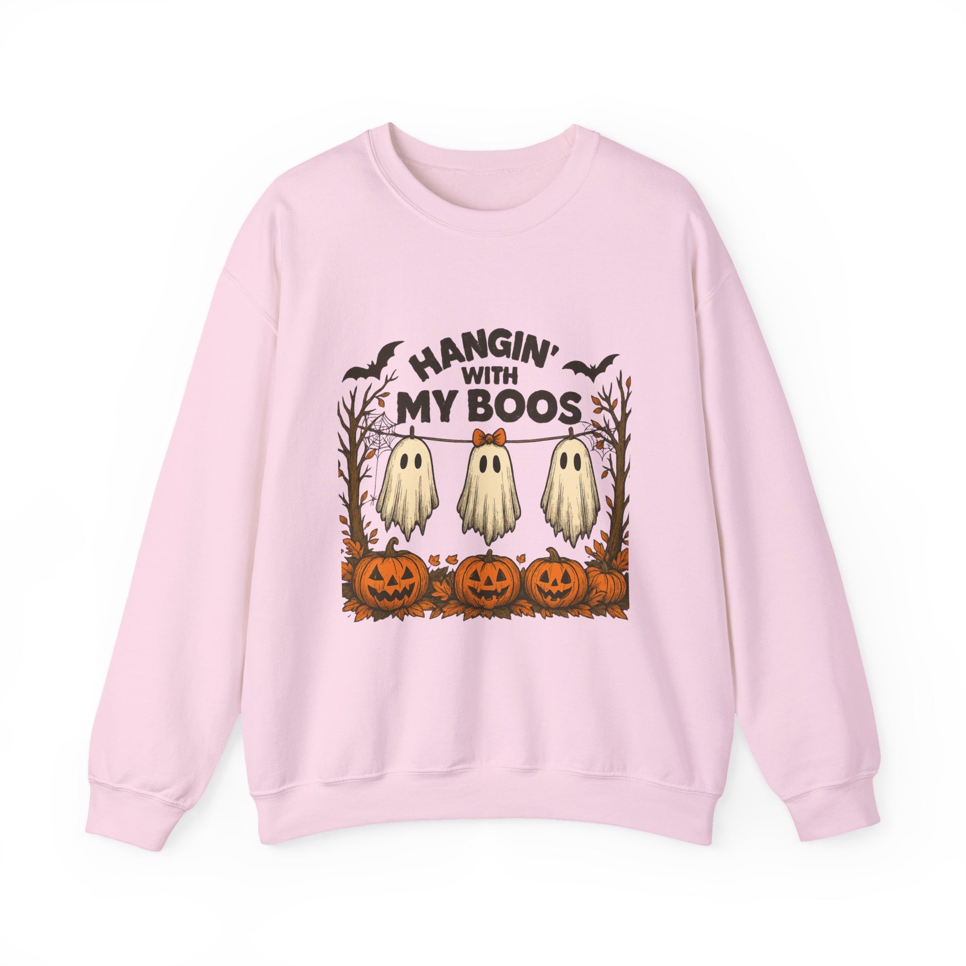 Embrace the spirit of Halloween with this cozy Crewneck Sweatshirt! Perfect for all ghost and pumpkin lovers, it features a playful design that reads, "Hangin' with My Boos," accompanied by adorable ghost illustrations. Crafted for ultimate comfort, this sweatshirt keeps you warm during chilly autumn nights while adding a touch of festive fun to your wardrobe. Ideal for casual gatherings, pumpkin patch visits, or cozy movie nights, it's perfect for individuals who celebrate Halloween or simply enjoy playful, seasonal style. Make this your go-to piece for Halloween parties, family celebrations, or spooky-themed events!
