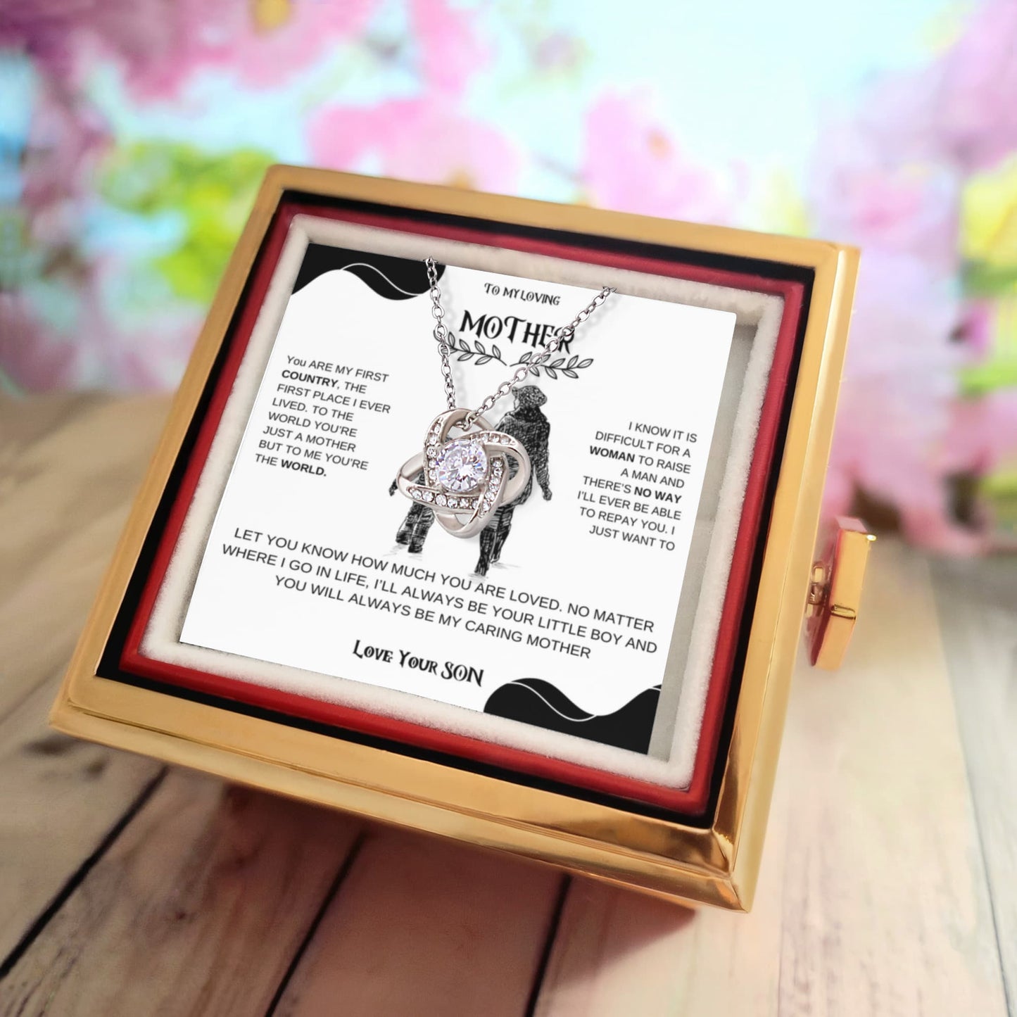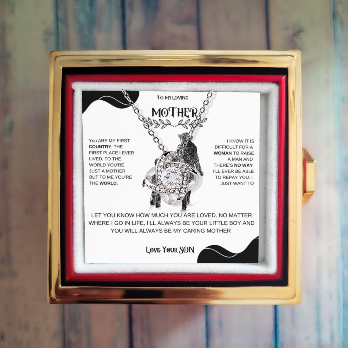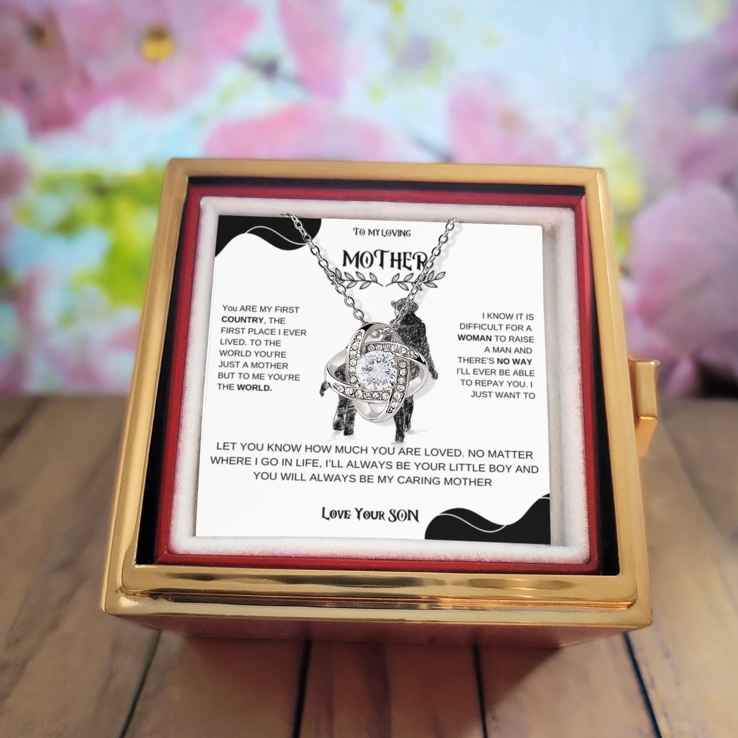 Imagine her reaction as she receives this beautiful Love Knot Necklace. Representing an unbreakable bond between two souls, this stunning pendant is adorned with premium cubic zirconia crystals, making it a timeless symbol of love and devotion. The luxurious box, featuring a meticulously preserved rose that never fades, adds an extra touch of love. With a simple turn of the gold knob, her breathtaking gift is revealed—making it the perfect sentimental gift for that special someone.