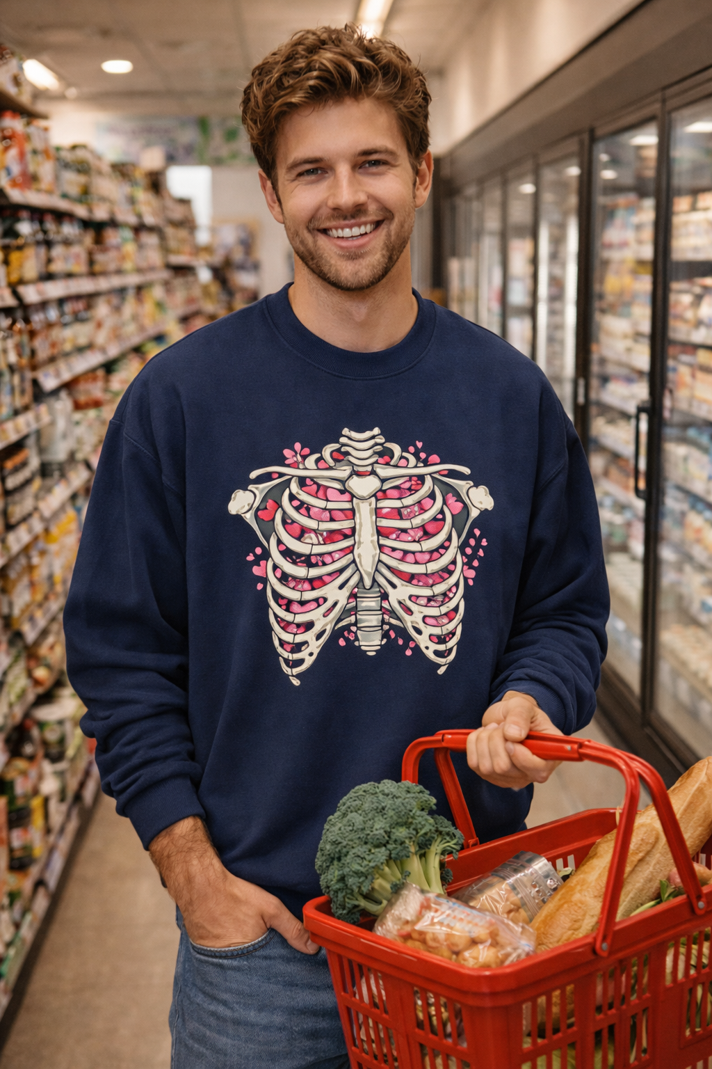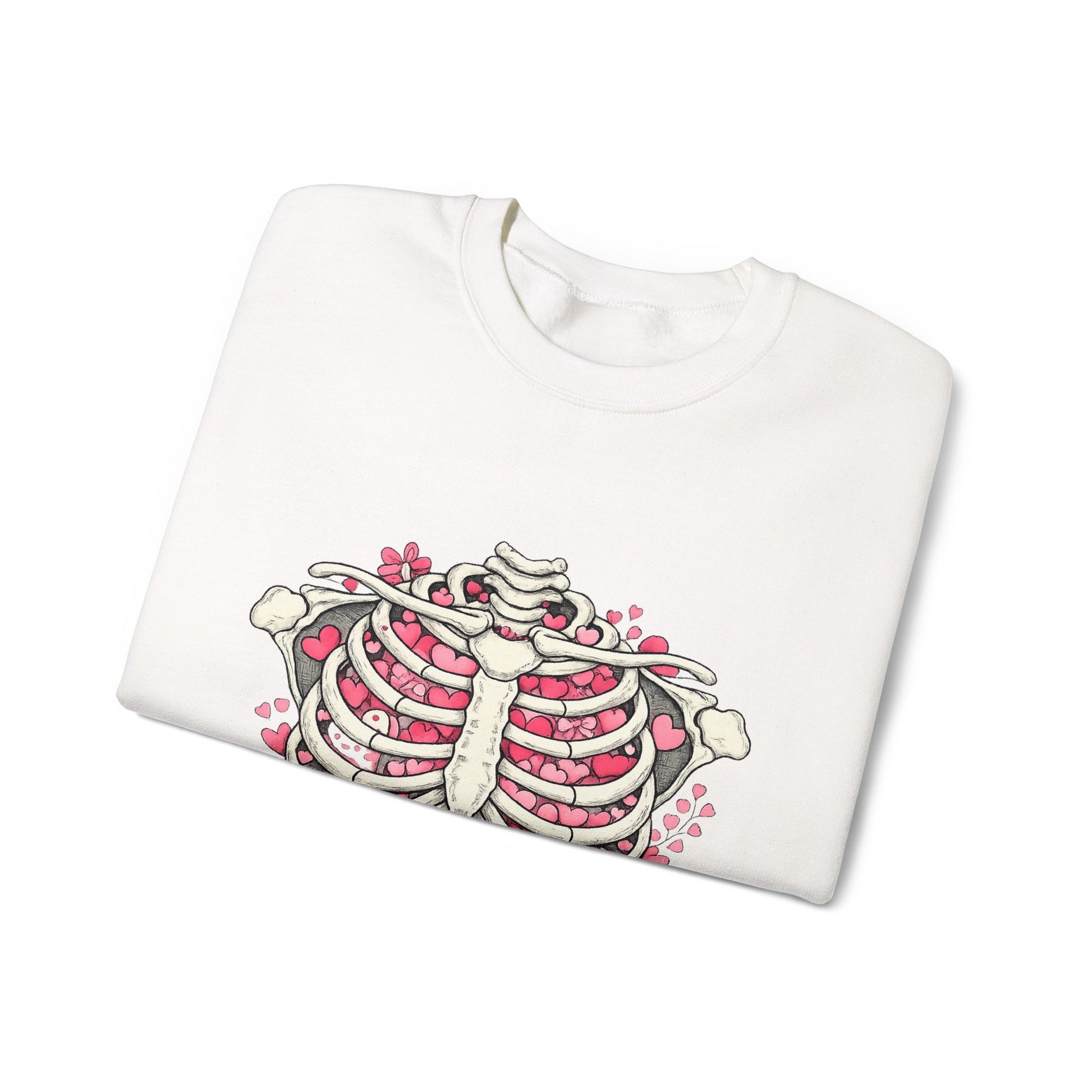 A soft, classic crewneck designed to feel lived-in from the first wear. The clean white sweatshirt features an embroidered anatomical ribcage with delicate pink florals tucked between the bones — a blend of edgy and gentle that settles into everyday life. Layer it over a band tee on chilly mornings or pull it on after a long day in the studio. The midweight cotton-poly blend holds shape without feeling stiff, and the tubular knit construction keeps seams smooth under backpacks and bags. Wear it when you want something quiet but statement-making: low-key gallery nights, late-night drives, or slow weekends with tea and a sketchbook.