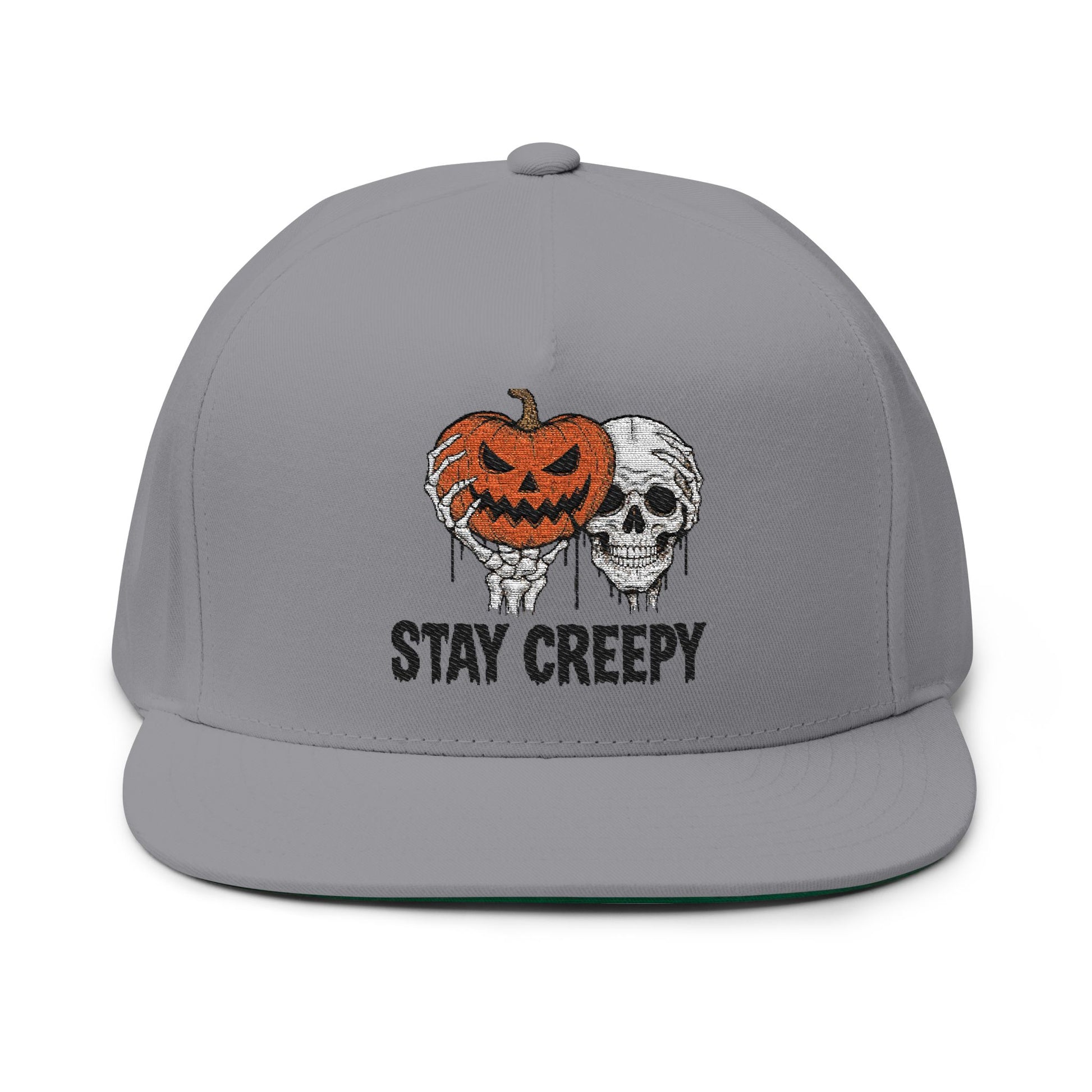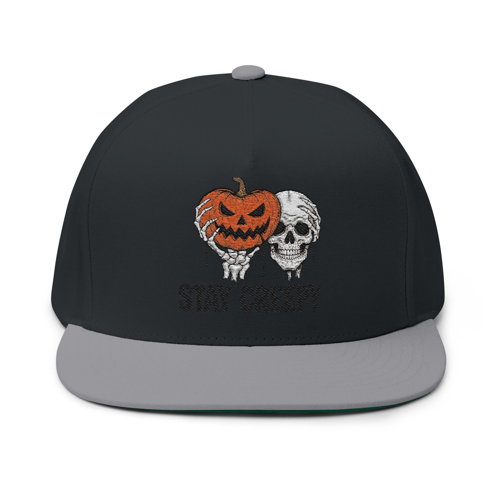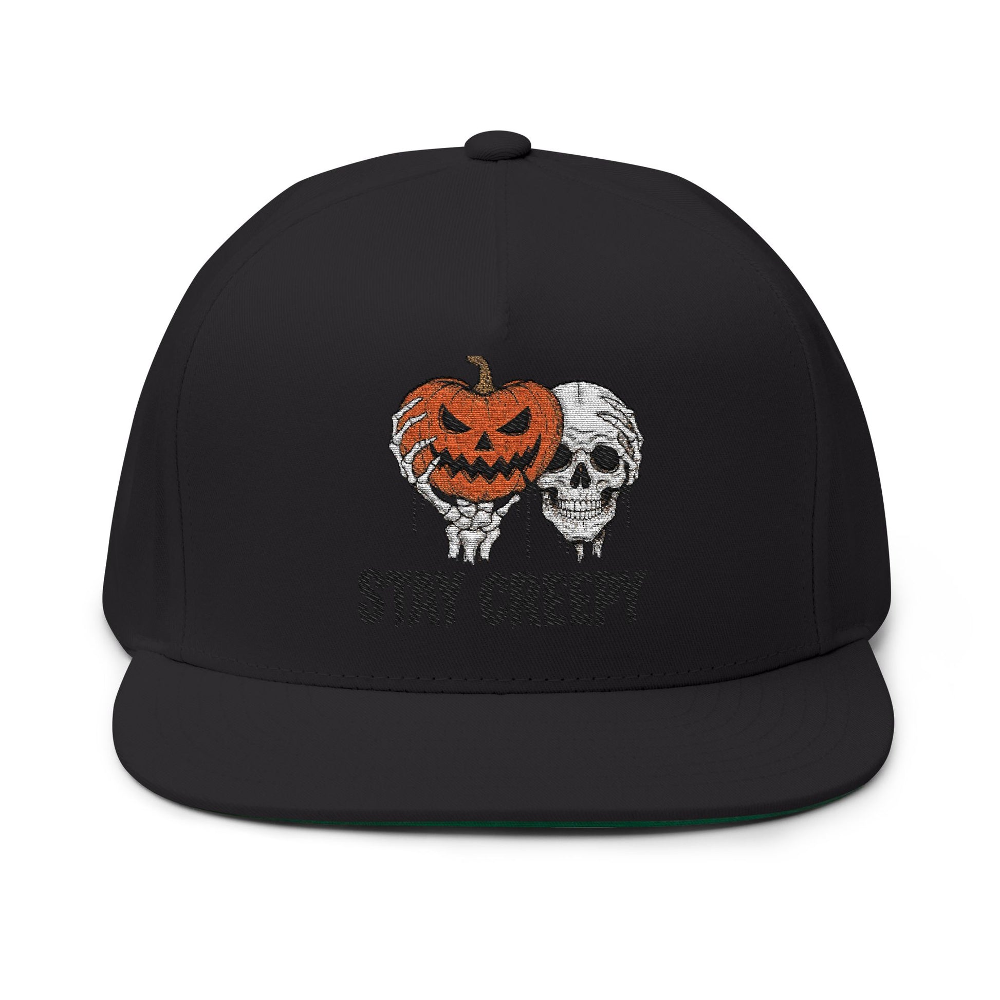 Stay Creepy Halloween Flat Bill Cap, Pumpkin Skull Hat, Embroidered Cap, Spooky Accessories, Trick or Treat Gear, Fall Fashion
